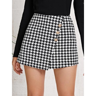 Shorts for Women Shorts Women's Shorts Gold Button Front Houndstooth Skort Shorts (Color : Black and White, Size : Large)