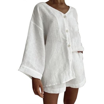 Casual 2 Piece Outfits Cotton Linen Set for Women Long Sleeve Button Down Shirts High Waisted Shorts Vacation Set