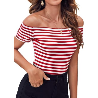 Striped Off The Shoulder Tops for Women Short Sleeve Sexy Fitted Pirate Shirt
