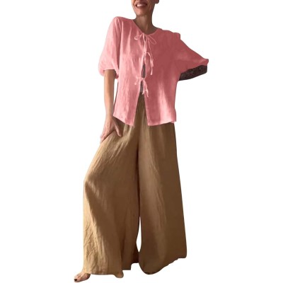Casual Linen Sets for Women Plus Size Trendy Summer 2 Piece Outfits Half Sleeve Shirt and Wide Leg Pant Suit Jumpsuits