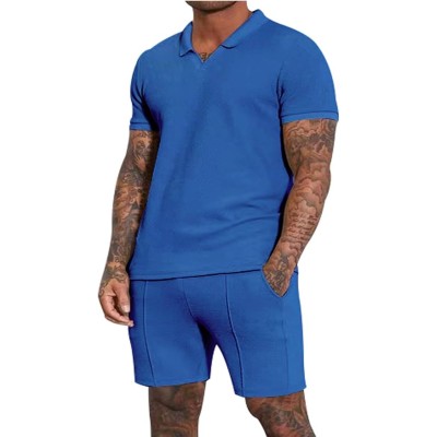 Men Waffle Knit Track Suits Summer Short Sleeve Polo Shirt and Shorts Set Casual Basic 2 Pieces Outfits with Pockets